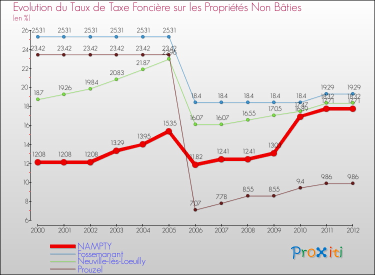 A Nampty, le taux de taxe foncière sur le non bâti a donc augmenté de 46.61 % entre 2000 et 2012.