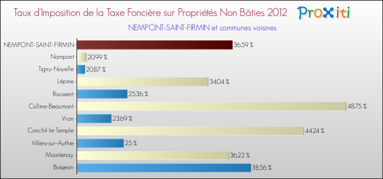 Vous trouverez ci-dessous des graphiques qui vous permettent de situer le taux de la taxe foncière sur le non bâti de Nempont-Saint-Firmin par rapport aux communes voisines.