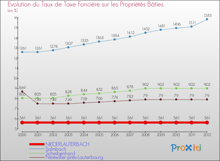 Pendant la même période, les communes françaises similaires à Niederlauterbach, ont vu leur taux de taxe foncière sur le bâti augmenter de 2.49 % en moyenne entre 2000 et 2012.
