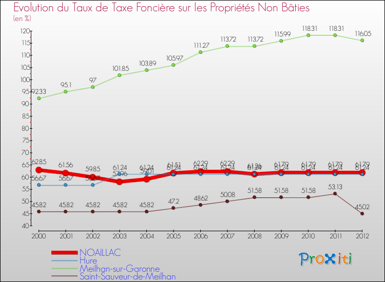Pendant la même période, les communes françaises similaires à Noaillac, ont vu leur taux de taxe foncière sur le non bâti augmenter de 19.23 % en moyenne entre 2000 et 2012.