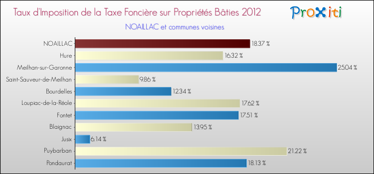 En 2012, le taux de la taxe foncière sur le bâti vôté par le conseil municipal de Noaillac était de : 18.37 %.