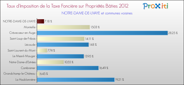 En 2012, le taux de la taxe foncière sur le bâti vôté par le conseil municipal de Notre-Dame-de-Livaye était de : 7.18 %.