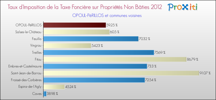 En 2012, le taux de la taxe foncière sur le non bâti vôté par le conseil municipal de Opoul-Périllos était de : 59.25 %.