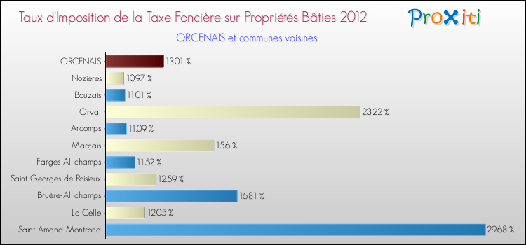 En 2012, le taux de la taxe foncière sur le bâti vôté par le conseil municipal de Orcenais était de : 13.01 %.