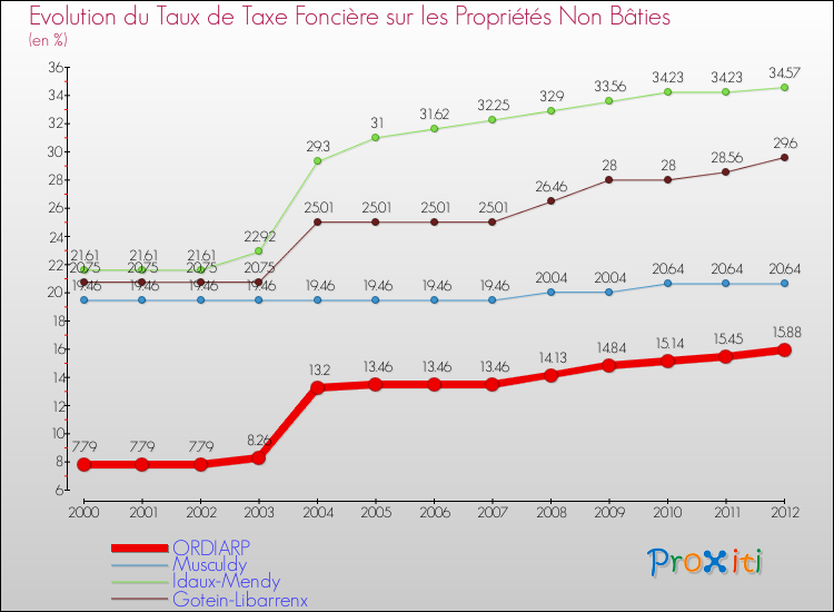 A Ordiarp, le taux de taxe foncière sur le non bâti a donc augmenté de 103.85 % entre 2000 et 2012.