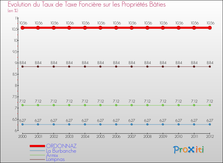 En 2012, le taux de la taxe foncière sur le bâti vôté par le conseil municipal de Ordonnaz était de : 10.56 %.