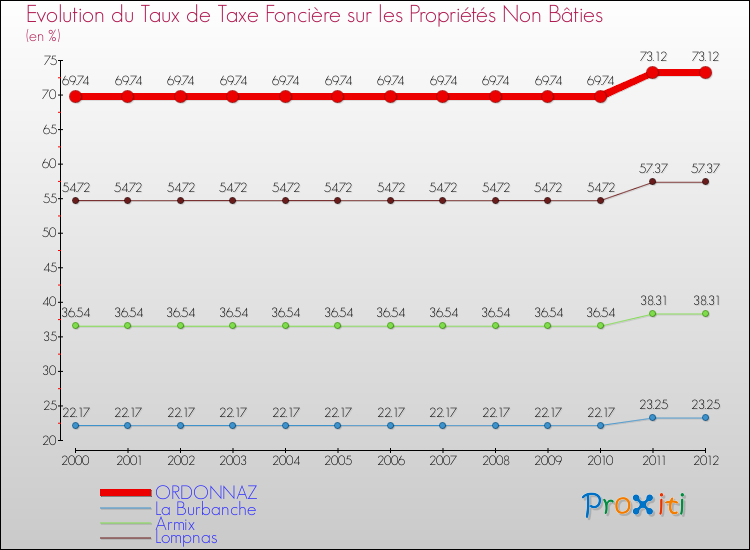 A Ordonnaz, le taux de taxe foncière sur le non bâti a donc augmenté de 4.85 % entre 2000 et 2012.