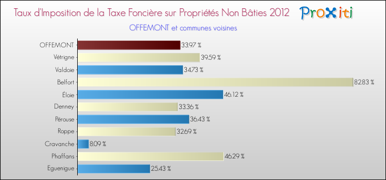 En 2012, le taux de la taxe foncière sur le non bâti vôté par le conseil municipal de Offemont était de : 33.97 %.