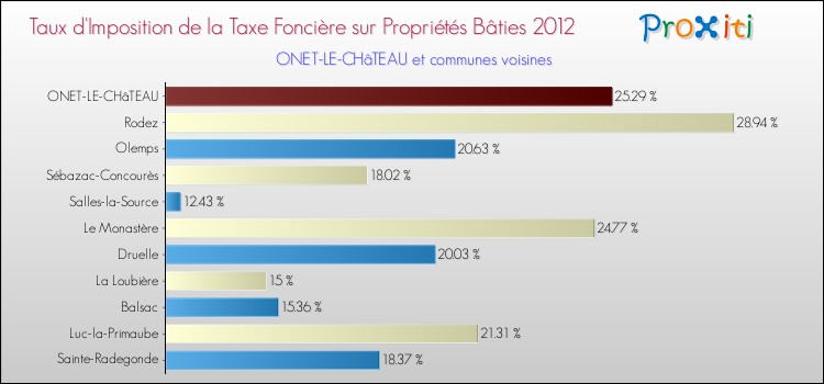 En 2012, le taux de la taxe foncière sur le bâti vôté par le conseil municipal de Onet-le-Château était de : 25.29 %.