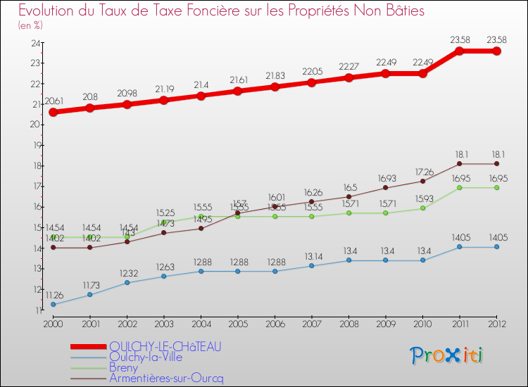 A Oulchy-le-Château, le taux de taxe foncière sur le non bâti a donc augmenté de 14.41 % entre 2000 et 2012.