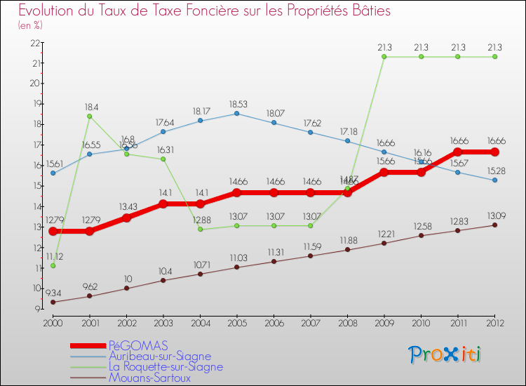 Pendant la même période, les communes françaises similaires à Pégomas, ont vu leur taux de taxe foncière sur le bâti augmenter de 19.32 % en moyenne entre 2000 et 2012.