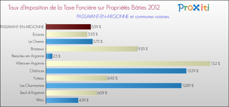 En 2012, le taux de la taxe foncière sur le bâti vôté par le conseil municipal de Passavant-en-Argonne était de : 5.59 %.