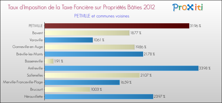 En 2012, le taux de la taxe foncière sur le bâti vôté par le conseil municipal de Petiville était de : 31.96 %.