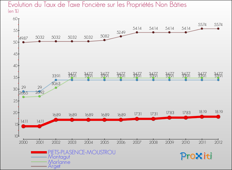Le graphique ci dessous représente l'évolution du taux de la taxe foncière sur le non bâti à Piets-Plasence-Moustrou depuis 2000.