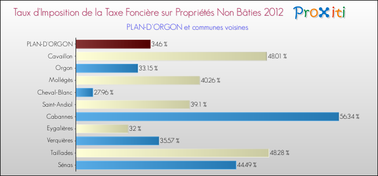 En 2012, le taux de la taxe foncière sur le non bâti vôté par le conseil municipal de Plan-d'Orgon était de : 34.6 %.