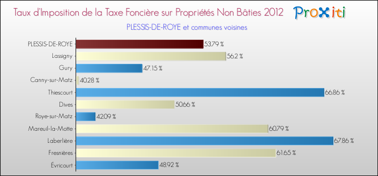 En 2012, le taux de la taxe foncière sur le non bâti vôté par le conseil municipal de Plessis-de-Roye était de : 53.79 %.