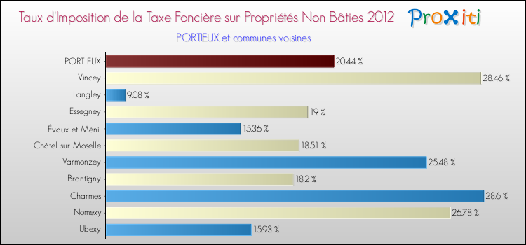 Pendant la même période, les communes françaises similaires à Portieux, ont vu leur taux de taxe foncière sur le non bâti augmenter de 9.55 % en moyenne entre 2000 et 2012.