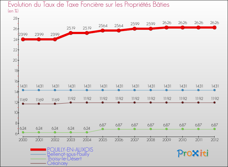 A Pouilly-en-Auxois, le taux de taxe foncière sur le bâti a donc augmenté de 9.46 % entre 2000 et 2012.