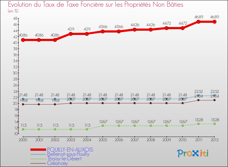 En 2012, le taux de la taxe foncière sur le non bâti vôté par le conseil municipal de Pouilly-en-Auxois était de : 46.89 %.