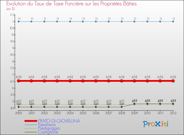 En 2012, le taux de la taxe foncière sur le bâti vôté par le conseil municipal de Prato-di-Giovellina était de : 6.53 %.