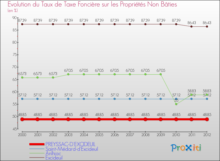Pendant la même période, les communes françaises similaires à Preyssac-d'Excideuil, ont vu leur taux de taxe foncière sur le non bâti augmenter de 25.51 % en moyenne entre 2000 et 2012.