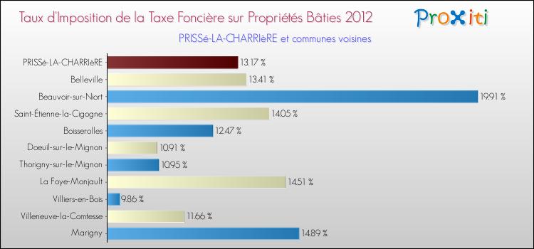 En 2012, le taux de la taxe foncière sur le bâti vôté par le conseil municipal de Prissé-la-Charrière était de : 13.17 %.
