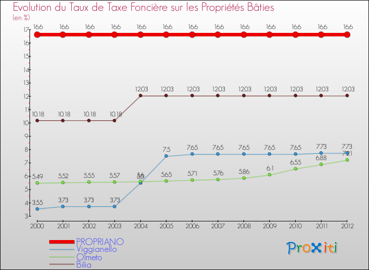 A Propriano, le taux de taxe foncière sur le bâti a donc augmenté de 0 % entre 2000 et 2012.