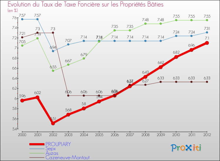 A Proupiary, le taux de taxe foncière sur le bâti a donc augmenté de 19.13 % entre 2000 et 2012.