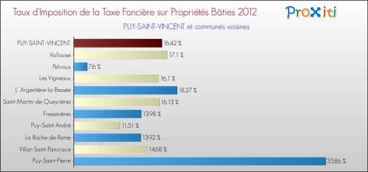 En 2012, le taux de la taxe foncière sur le bâti vôté par le conseil municipal de Puy-Saint-Vincent était de : 16.42 %.