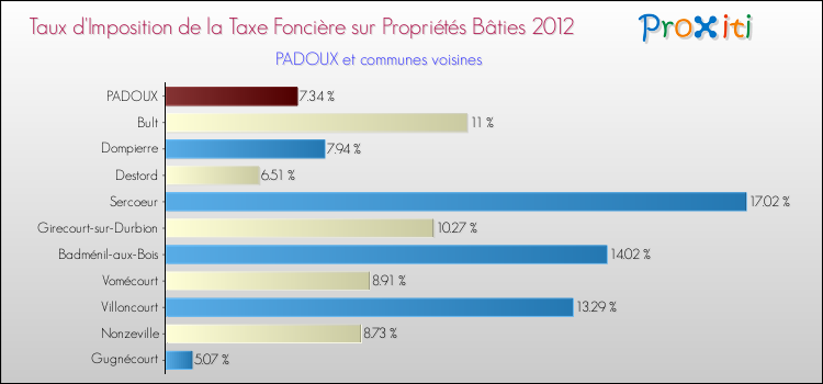 En 2012, le taux de la taxe foncière sur le bâti vôté par le conseil municipal de Padoux était de : 7.34 %.