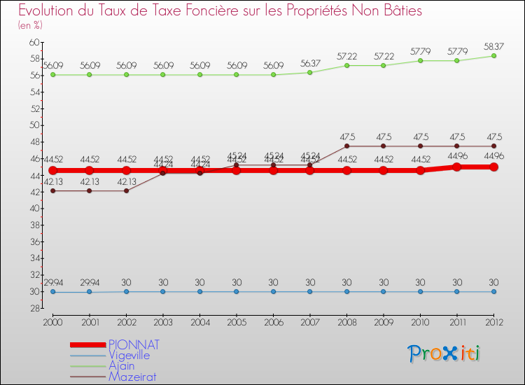 En 2012, le taux de la taxe foncière sur le non bâti vôté par le conseil municipal de Pionnat était de : 44.96 %.