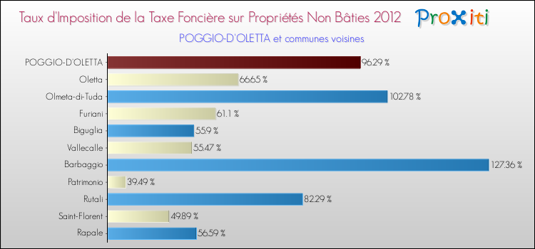 En 2012, le taux de la taxe foncière sur le non bâti vôté par le conseil municipal de Poggio-d'Oletta était de : 96.29 %.
