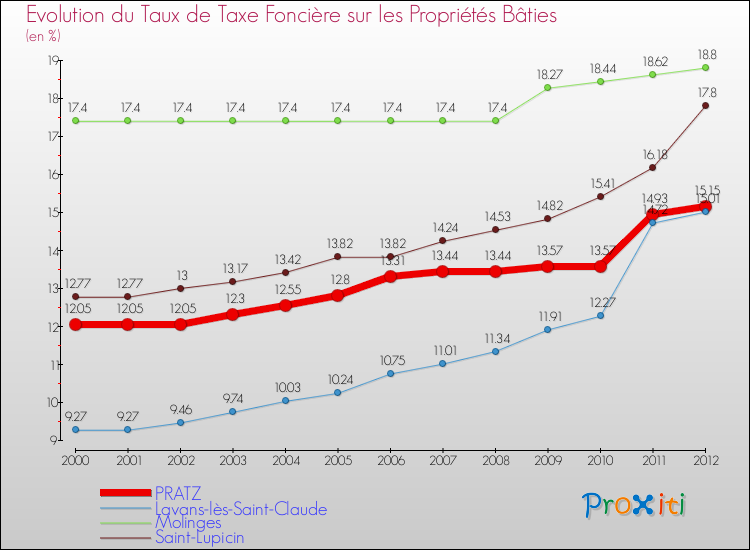 A Pratz, le taux de taxe foncière sur le bâti a donc augmenté de 25.73 % entre 2000 et 2012.