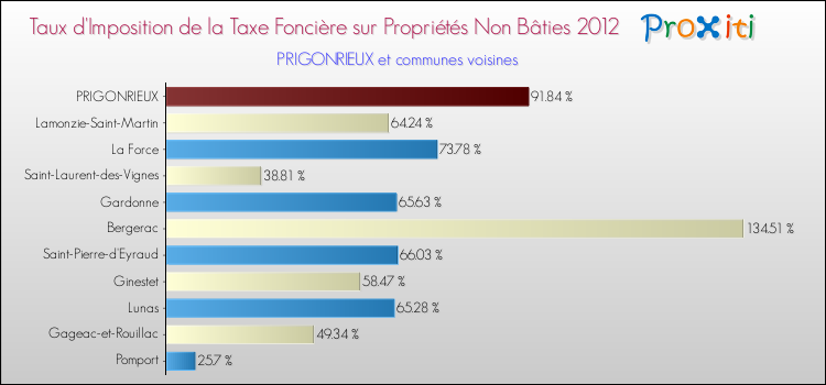 En 2012, le taux de la taxe foncière sur le non bâti vôté par le conseil municipal de Prigonrieux était de : 91.84 %.