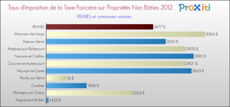 Vous trouverez ci-dessous des graphiques qui vous permettent de situer le taux de la taxe foncière sur le non bâti de Remies par rapport aux communes voisines.