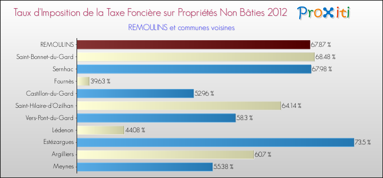 A noter : la valeur moyenne de ce taux de taxe foncière sur le non bâti dans les communes françaises similaires à Remoulins était de 51.49 %, en 2012.