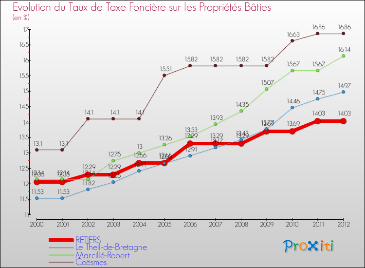 A Retiers, le taux de taxe foncière sur le bâti a donc augmenté de 16.43 % entre 2000 et 2012.