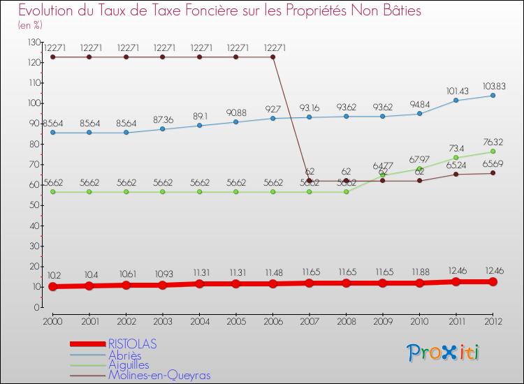 Pendant la même période, les communes françaises similaires à Ristolas, ont vu leur taux de taxe foncière sur le non bâti augmenter de 4.04 % en moyenne entre 2000 et 2012.