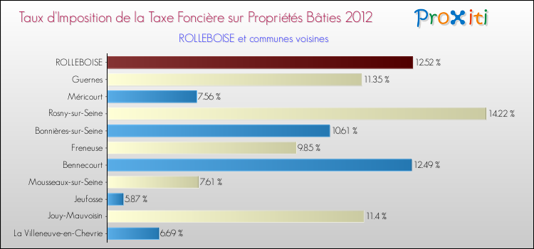 En 2012, le taux de la taxe foncière sur le bâti vôté par le conseil municipal de Rolleboise était de : 12.52 %.