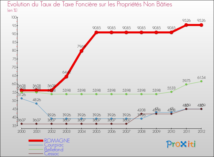 A Romagne, le taux de taxe foncière sur le non bâti a donc augmenté de 69.86 % entre 2000 et 2012.