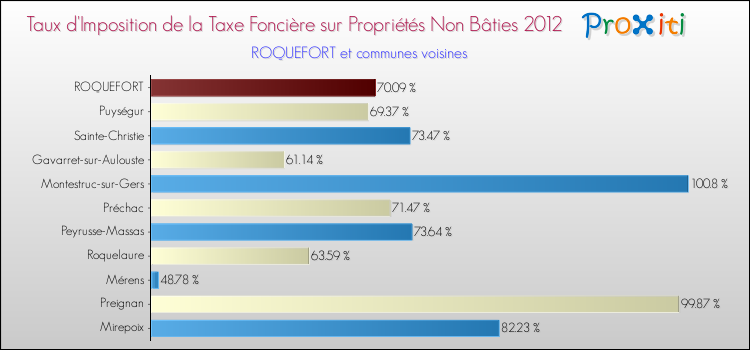 En 2012, le taux de la taxe foncière sur le non bâti vôté par le conseil municipal de Roquefort était de : 70.09 %.