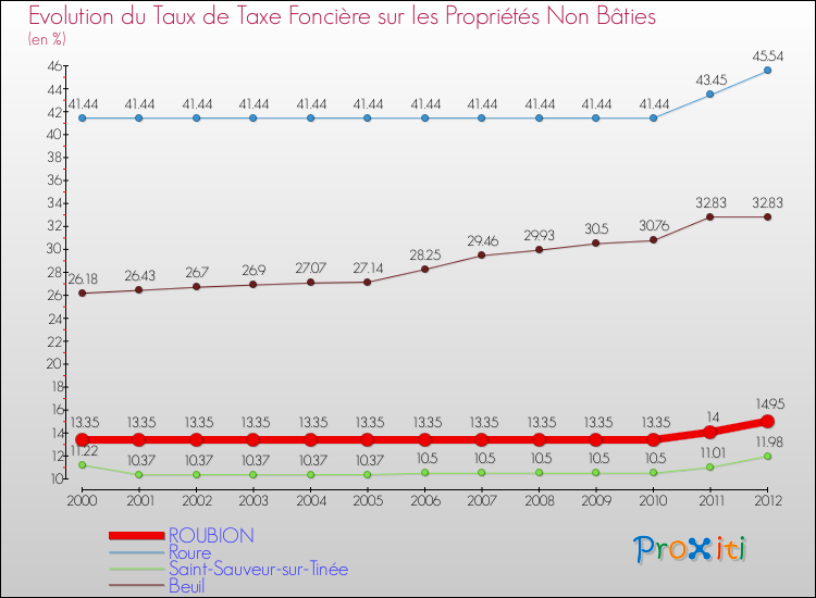 Pendant la même période, les communes françaises similaires à Roubion, ont vu leur taux de taxe foncière sur le non bâti augmenter de 48.39 % en moyenne entre 2000 et 2012.