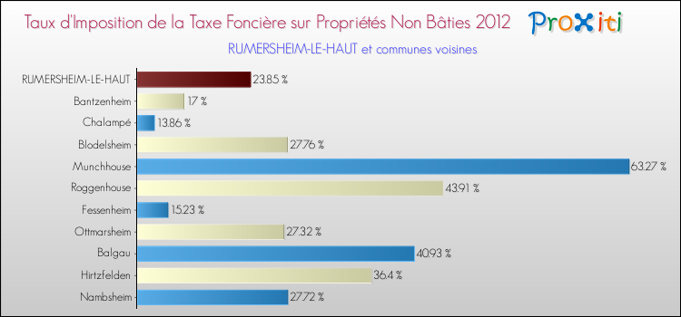 En 2012, le taux de la taxe foncière sur le non bâti vôté par le conseil municipal de Rumersheim-le-Haut était de : 23.85 %.