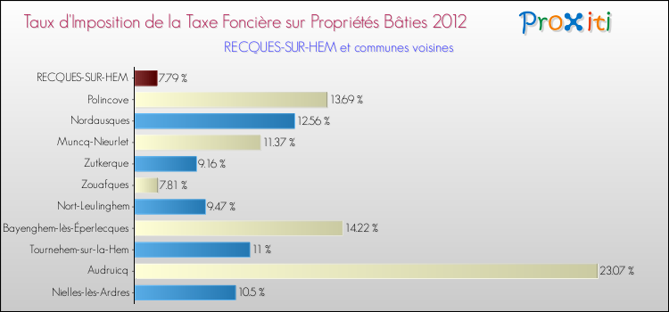 A noter : la valeur moyenne de ce taux de taxe foncière sur le bâti dans les communes françaises similaires à Recques-sur-Hem était de 13.59 %, en 2012.