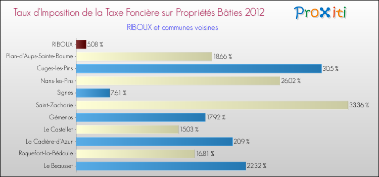 Vous trouverez ci-dessous des graphiques qui vous permettent de situer le taux de la taxe foncière sur le bâti de Riboux par rapport aux communes voisines.