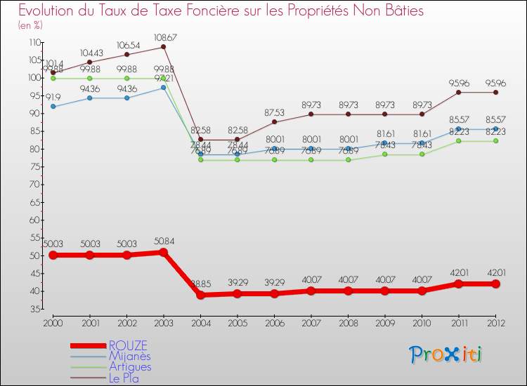 A Rouze, le taux de taxe foncière sur le non bâti a donc baissé de 16.03 % entre 2000 et 2012.