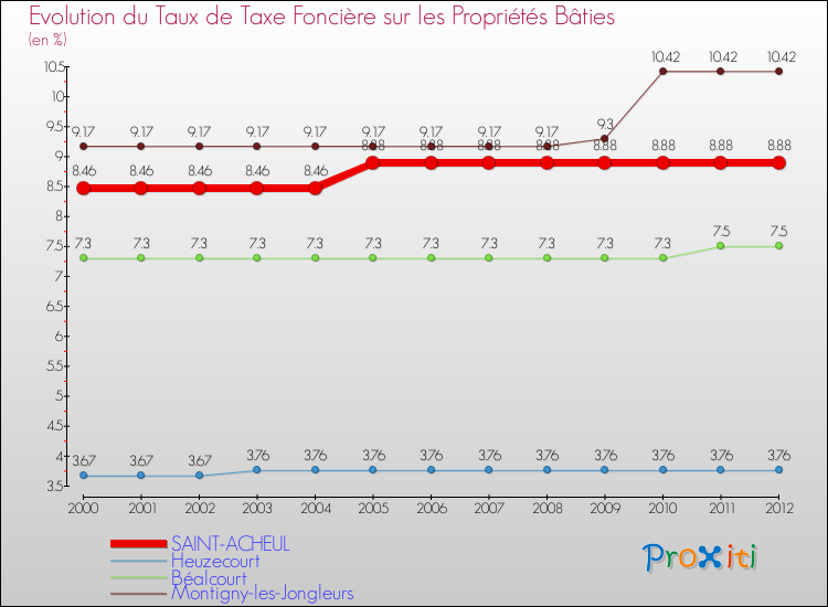 Pendant la même période, les communes françaises similaires à Saint-Acheul, ont vu leur taux de taxe foncière sur le bâti augmenter de 7.68 % en moyenne entre 2000 et 2012.
