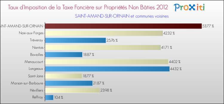 Vous trouverez ci-dessous des graphiques qui vous permettent de situer le taux de la taxe foncière sur le non bâti de Saint-Amand-sur-Ornain par rapport aux communes voisines.