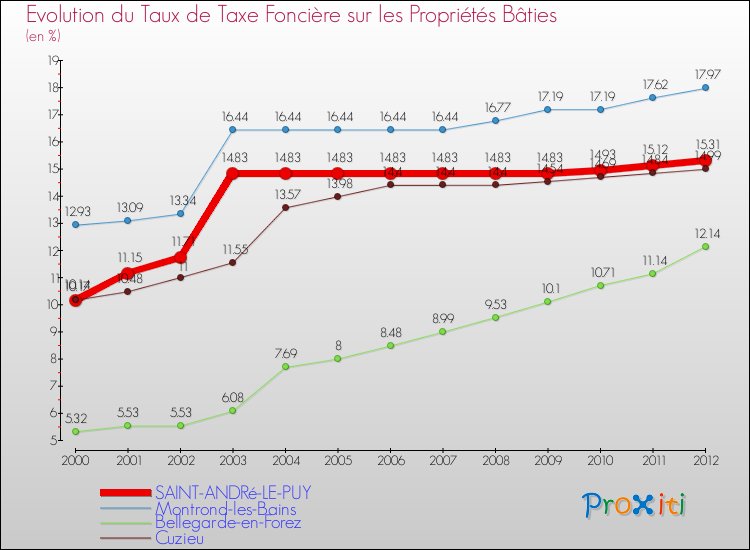 A Saint-André-le-Puy, le taux de taxe foncière sur le bâti a donc augmenté de 50.99 % entre 2000 et 2012.