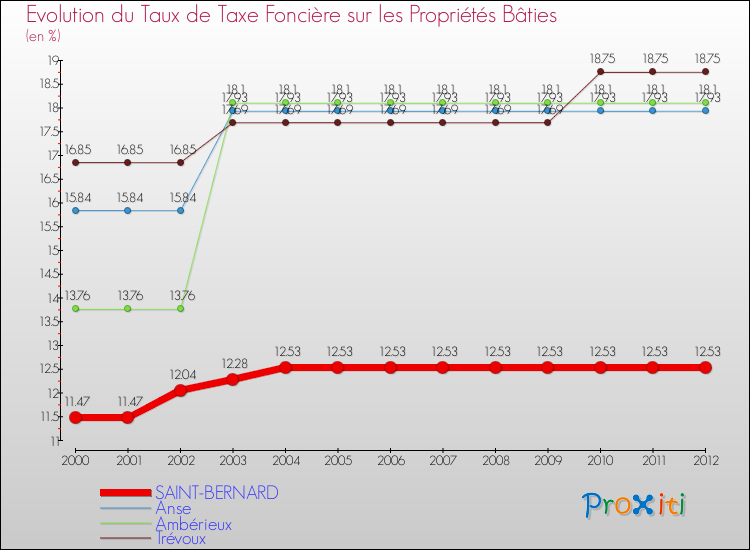 En 2012, le taux de la taxe foncière sur le bâti vôté par le conseil municipal de Saint-Bernard était de : 12.53 %.